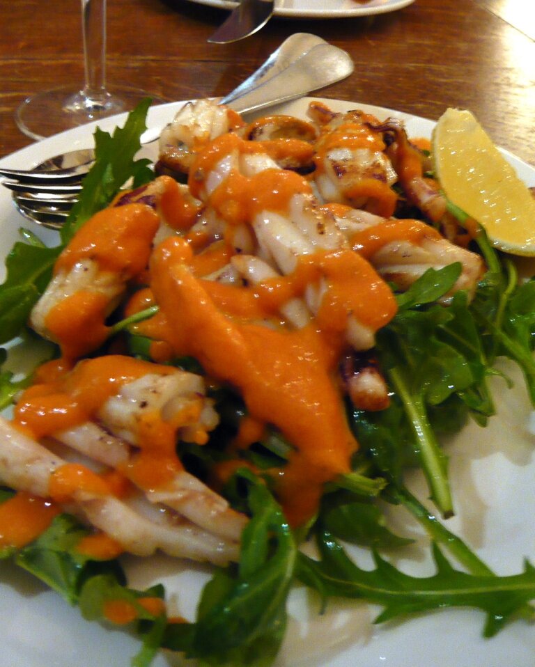 Pan fried calamari with wild rocket ($17). This was a large plate heaped with tender calamari and rocket with a dressing that I’ve forgotten but also not memorable.